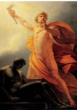 하지만 인간은 다른 동물들을 공격할만한 날카로운 발톱이나 이빨도 없었고 위험에서 자신을 보호할 단단한 갑옷이나 등딱지도 없어 매우 약한 존재였다. 프로메테우스는 자신이 만들어낸 인간의 연약함을 불쌍히 여겨, 몰래 신들만이 사용할 수 있었던 불을 훔쳐내 인간에게 주었다. 이후로 인간은 이 땅에 사는 동물 중 가장 강력한 힘을 가지게 되었다. -그리스 신화 중에서 '프로메테우스와 인간'